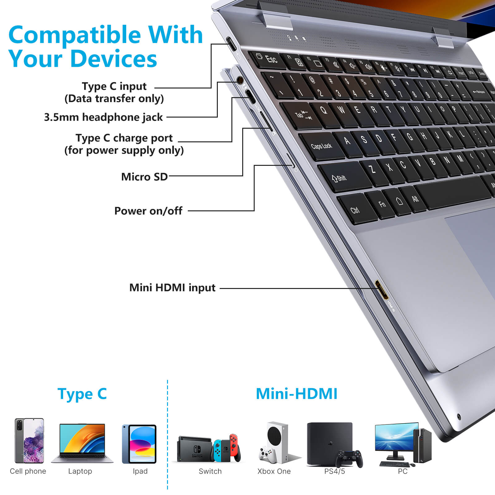 • Design Rotatif à 360° : Passez facilement d'un mode à l'autre—idéal pour les jeux, les présentations ou la saisie de texte.