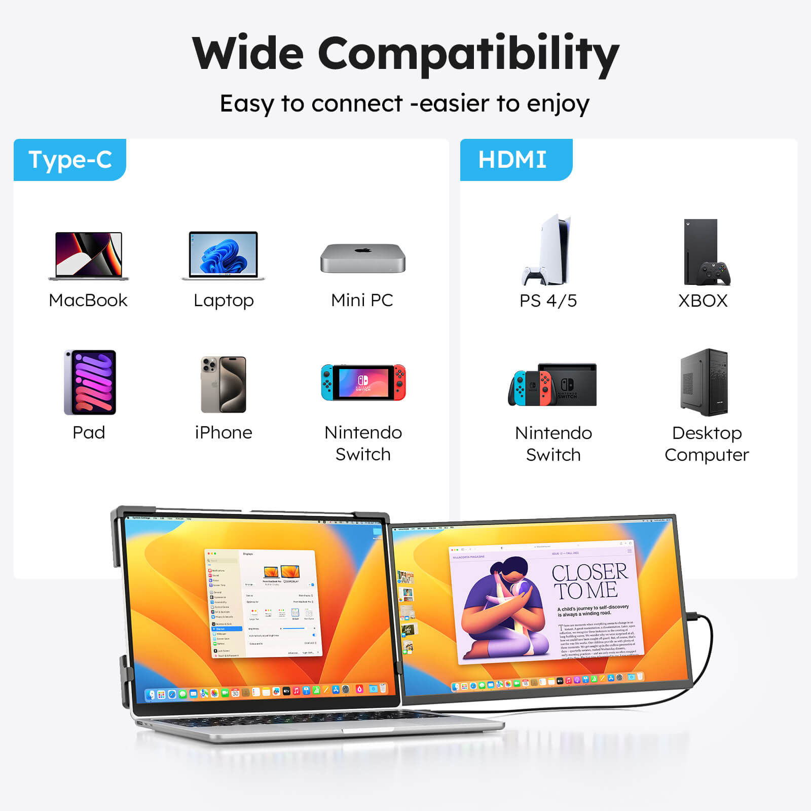 Experience ultimate productivity with the 15.6" FHD Portable Dual Monitor. Featuring two vibrant 1920x1080 IPS screens in a foldable, travel-ready design, this plug-and-play display extends your workspace for professionals, gamers, and digital nomads.